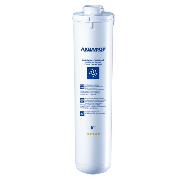 Вес, кг (нетто) изделия0,6Механическая фильтрацияЗадерживает ржавчину, ил, песок, как “сито”. Если в фильтре несколько картриджей - первый отсекает самые крупные частицы, а каждый последующий - более мелкие. Существуют картриджи, в которых есть только механическая очистка (полипропиленовые, не “впитывают” растворенные примеси). Они обычно стоят первыми по ходу воды, чтобы продлить жизнь угольным (сорбционным) картриджам, которые ещё и впитывают вредные примеси, как губка.даИонный обменНужен, чтобы умягчать воду, а также задерживать тяжелые металлы. За это отвечают ионно-обменная смола и Аквален (волокна, которые есть во всех фильтрах Аквафор, чтобы устранять тяжелые металлы даже из жесткой воды). Чем больше ионно-обменной смолы - тем лучше фильтр справится с жесткостью. В небольшом количестве она есть во всех фильтрах под мойку. Если же в фильтре есть отдельный картридж, заполненный такой смолой (например, KH), - фильтр помогает умягчать воду. Для слишком жесткой воды (более 5 мкв) лучше выбрать фильтр обратного осмоса.даСорбцияСпособность “впитывать” из воды растворенные, “невидимые” вредные примеси, по принципу губки. Активированный уголь - основной сорбционный материал, который используется в картриджах фильтров для питьевой воды. Например, именно так из воды удаляется хлор.даУмягчениеУдаление из воды солей жесткости (солей кальция и магния, из-за которых образуется накипь в чайнике, белые пятна на посуде, известковый налет). Фильтры обратного осмоса абсолютно умягчают воду с любой концентрацией солей (то есть удаляют соли жесткости полностью). Проточные фильтры со специальными картриджами рекомендуются только для умягчения воды средней жесткости (той, в которой средняя концентрация солей кальция и магния - до 5 млэкв/литр).нетПрименениедля холодной водыФильтрует частицы крупнее, мкмЧем меньше цифра, тем более мелкие частицы способен задержать фильтр. Например, любой фильтр под мойку справится с ржавчиной, илом и песком, но не каждый - с бактериями (на это способен картридж с половолоконной мембраной и системы обратного осмоса). Если в фильтре несколько картриджей - первый отсекает самые крупные частицы, а каждый последующий - более мелкие. Цифра указана для картриджа самой тонкой очистки.3,0