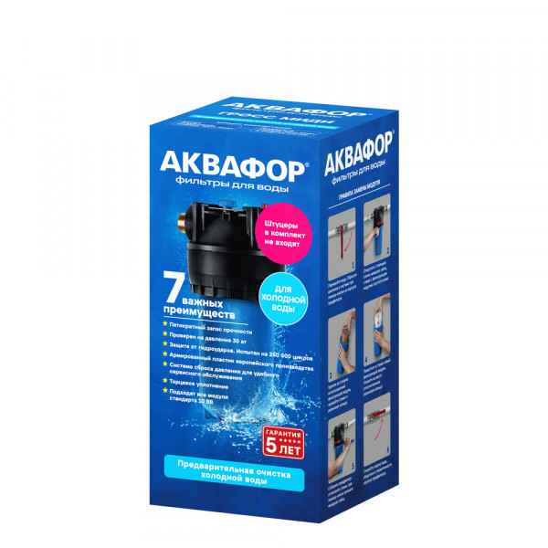 Габариты26,0 х 18,0 х 35,5 смРабочее давление воды, МПа (бар)до 6,2 атмРабочая температура, °C5-40Присоединительные размерыG1" или G 3/4"КомплектацияГотовый фильтр состоит из корпуса и картриджа для очистки воды. Если вы приобретаете только корпус, необходимо отдельно купить подходящий к нему картридж: это может быть картридж для механической очистки воды от ржавчины, картридж для глубокой очистки воды от хлора.только корпусВодаКартриджи и корпуса фильтров рассчитаны на определенную температуру воды. Данные технические характеристики важно учитывать, поскольку от этого зависит качество очистки и срок службы фильтра.холоднаяМатериал корпусаПищевой пластик: Допущен к контакту с пищевыми продуктами. Нержавеющая сталь: Долговечный и безопасный корпус из нержавеющей пищевой стали.пищевой пластикДля холодной водыда