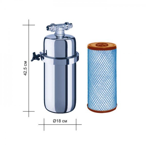 Не забывайте учитывать и срок службы фильтра: он указан в паспорте и определяет, когда модуль нужно заменить, даже если ресурс активной фильтрации в литрах еще есть.60000Вес, кг (нетто) изделия5,8Высота, смОбратите внимание на габариты фильтра и измерьте, сколько свободного пространства в предполагаемом месте установки.42,5Механическая фильтрацияЗадерживает ржавчину, ил, песок, как “сито”. Если в фильтре несколько картриджей - первый отсекает самые крупные частицы, а каждый последующий - более мелкие. Существуют картриджи, в которых есть только механическая очистка (полипропиленовые, не “впитывают” растворенные примеси). Они обычно стоят первыми по ходу воды, чтобы продлить жизнь угольным (сорбционным) картриджам, которые ещё и впитывают вредные примеси, как губка.даСорбцияСпособность “впитывать” из воды растворенные, “невидимые” вредные примеси, по принципу губки. Активированный уголь - основной сорбционный материал, который используется в картриджах фильтров для питьевой воды. Например, именно так из воды удаляется хлор.даФильтрует частицы крупнее, мкмЧем меньше цифра, тем более мелкие частицы способен задержать фильтр. Например, любой фильтр под мойку справится с ржавчиной, илом и песком, но не каждый - с бактериями (на это способен картридж с половолоконной мембраной и системы обратного осмоса). Если в фильтре несколько картриджей - первый отсекает самые крупные частицы, а каждый последующий - более мелкие. Цифра указана для картриджа самой тонкой очистки.5,0Фильтрующий модуль в комплектедаДавление в водопроводе не более, атмМаксимальное давление воды на входе в систему, при котором возможна стабильная работа фильтра.6,5Ширина, смОбратите внимание на габариты фильтра, и измерьте, сколько свободного пространства в предполагаемом месте установки.18,0Глубина, смОбратите внимание на габариты фильтра, и измерьте, сколько свободного пространства в предполагаемом месте установки.18,0Защита корпуса от гидроударовдаСкорость фильтрации, л/минСкорость подачи отфильтрованной воды из крана чистой воды на мойке. Например, при скорости фильтрации 2,5 литра/минуту стакан 200 мл. наполнится меньше, чем за 10 секунд.15,0КомплектацияГотовый фильтр состоит из корпуса и картриджа для очистки воды. Если вы приобретаете только корпус, необходимо отдельно купить подходящий к нему картридж: это может быть картридж для механической очистки воды от ржавчины, картридж для глубокой очистки воды от хлора.готовый фильтрВодаКартриджи и корпуса фильтров рассчитаны на определенную температуру воды. Данные технические характеристики важно учитывать, поскольку от этого зависит качество очистки и срок службы фильтра.холоднаяМатериал корпусаПищевой пластик: Допущен к контакту с пищевыми продуктами. Нержавеющая сталь: Долговечный и безопасный корпус из нержавеющей пищевой стали.нержавеющая стальОчисткаМеханическая очистка: Задерживает ржавчину, ил, песок, как “сито”. В корпусе предфильтра с механической очисткой установлен полипропиленовый модуль. Глубокая очистка: Подходит, чтобы купать детей в чистой воде. Делает прием душа и умывание более приятным. Фильтр глубокой очистки воды во всей квартире не только останавливает ржавчину, ил, песок, но и впитывает растворенные опасные примеси, как губка. Удаляет из воды хлор, хлорорганические вещества, 